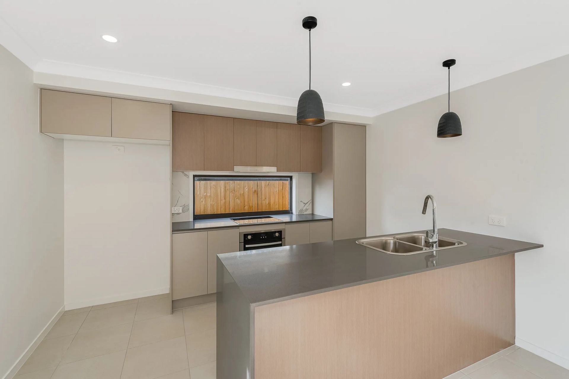 – Modern kitchen with stone benchtops and stainless-steel appliances